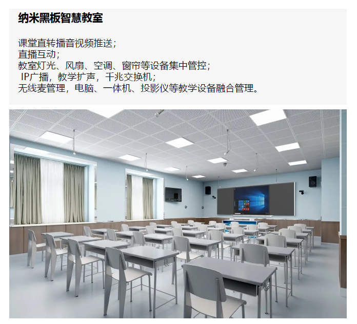 功能介紹: 設備智能集控及物聯系統 直接連接投影機、觸控一體機、音箱、實物展臺、高清攝像頭、錄播設備、電腦等教學設備,通過物聯模塊連接燈、風扇、空調、門禁,話筒等用電設備。可將教室里面相互獨立的班班通、錄播、用電設備等融合在一個平臺,讓設備互通互聯,老師可通過本地控制面板,一鍵開啟/關閉用電設備電源,一鍵切換電腦、廣播、視頻展臺等信號源。