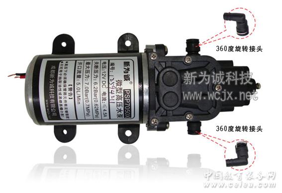 產品詳細介紹微型水泵,微型高壓水泵,12V直流水泵,24V直流水泵,自吸水泵,隔膜水泵 24V直流水泵 新為誠品牌--自帶泄壓、過壓雙保護開關PSP系列 型號:PSP7050X 壓力:7公斤 流量:5L/Min 電壓:直流12V(24V),可接車載電瓶 1.主要特點:體積小、重量輕(1.2kg),壓力高(最大可穩定在7公斤工作),流量大(5L/MIN),低噪音。 2.泵自帶過壓/泄壓雙保護功能。 (過壓保護:輸出壓力超過泵的壓力保護開關閥值時,自動停機保護;直到壓力降到低于閥值后才重新啟動; 泄壓保護:大于設定壓力的多余壓力會自動被卸掉,讓新泵為穩定工作誠在設定壓力,不會自動停機。) 3.泵體自帶外徑12mm軟管接頭,額外贈送360度旋轉寶塔接頭2個(外徑10mm),方便連接不同內徑軟管! 4.自吸能力強,自吸高達2.5米,進出水口自帶密封圈,保證自吸及不漏水。 5.用途:性價比超高,可廣泛用于水轉移、水循環、噴霧、沖洗等用途。 6.對象:水處理、液體采樣,科研,儀器儀表,化工分析,醫療保健,醫藥衛生,生物工程,自動控制,環保等眾多領域的客戶。 “新為誠”微型泵,產品質保一年,并為您提供專業的售前咨詢及完善的售后服務。更多詳細參數請訪問【成都新為誠科技有限公司】網站: http://www.wcjx.net
