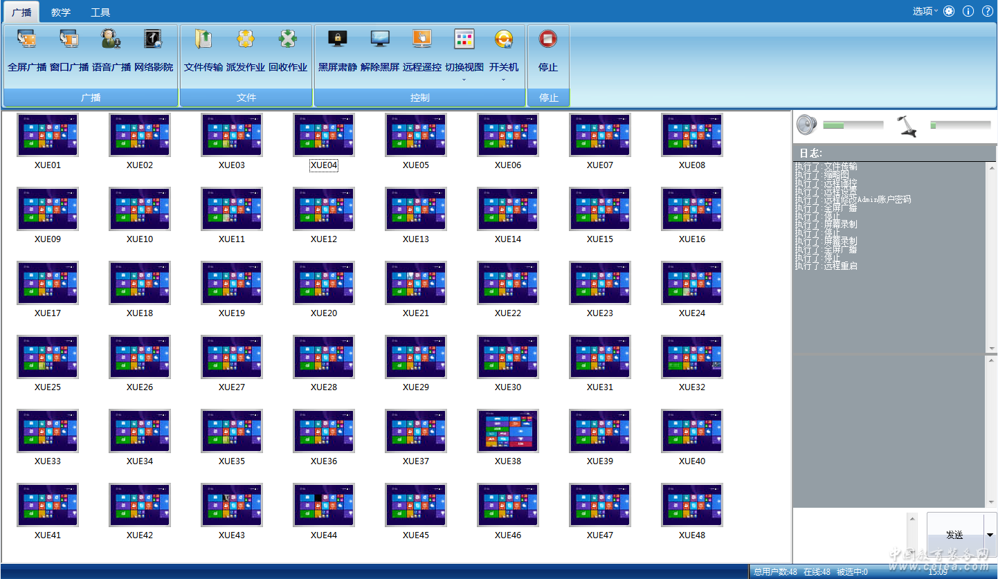 卓越的無線性能:在無線網絡課堂中,教師平板可以同時與 60 臺學生平板進行流暢無延時的互動教學,信號傳輸穩定不掉線。進行廣播教學時,教師端與學生端之間、不同學生端之間的平板屏幕均可實現完全同步。 核心功能 屏幕廣播 學生演示 黑屏肅靜 語音教學 網絡影院 遙控監視 視頻直播 綜合考試 收取作業 學生錄制 作業提交 屏幕錄制 提交作業 電子白板 電子點名 電腦配置 文件傳輸 聯機討論 遠程命令 信息交流 班級管理 斷網鎖屏 上網限制 設備鎖定 上網記錄 隨堂測試 資產管理 登錄前廣播 一鍵關閉程序 |
