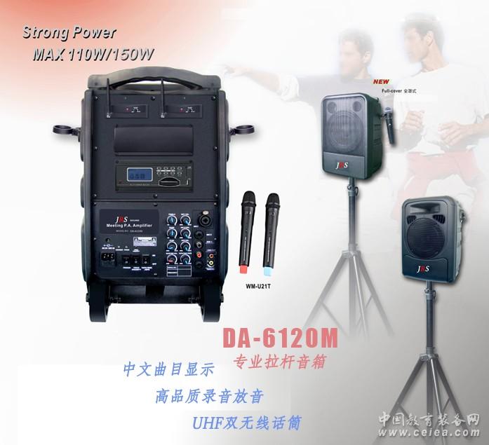 產品詳細介紹臺灣JRS<strong><a href="http://www.wxaudio.cn/audio/product/ydky/2011/0512/95.html">專業拉桿音箱-DA6120</a></strong>/D/M,采用最新D類數字功放芯片,音質清晰極低功耗,10寸低喇叭和1.5寸高音喇叭兩分頻設計,低音混厚有力高音清晰透明。內置充電電池一次充電可連續使用3-8小時,配有DVD/CD/USB/SD/MP3多功能播放機(選配),使您音樂播放卡啦OK演唱更加方便。適用于政府及企業流動解說、現場會議、戶外娛樂和教育教學等場合。大功率音頻輸出能滿足300以上的擴聲場合。<strong><a href="http://www.wxaudio.cn/">多功能無線擴音機</a></strong>是在一只音箱上集成了功放機、無線話筒、可充電電池、DVD/MP3播放器。<br /> ●戶外型廣播/娛樂/會議多用途擴音機,附帶拉輪,攜帶輕便<br /> ●豪華型設計,多組輸入輸出端子,可串接數臺同型號機型同時使用增加音量<br /> ●回音功能設計,亦可用于娛樂,卡拉OK唱歌<br /> ●內置優先啟動開關,啟動后所有麥克風具有講話優先功能<br /> ●具智能充電管理功能,可內置充電電池,無電源情況下可滿足3-8小時擴聲需求<br /> ●采用UHF頻段無線收發模組,可避免其它無線電裝置互相干擾<br /> ●具可伸縮拉桿、提手、滑動輪及三腳架固定點,方便移動和安裝。<br /> 接收頻率: UHF 560-890MHz 雙頻點可同時使用兩只無線話筒<br /> 頻率響應: 40Hz~20KHz <br /> 輸出功率: 150W <br /> 音源輸入:MP3/USB/3.5LINS/雙無線話筒 <br /> 調節旋鈕:高、低音可調、回聲效果可調、音源輸入分立可調<br /> 功電電池: 12V/14A <br /> 輸入電壓: AC 220V DC24V <br /> 外型尺寸: 350W×35D×510H( mm) <br /> 重量: 15kG |