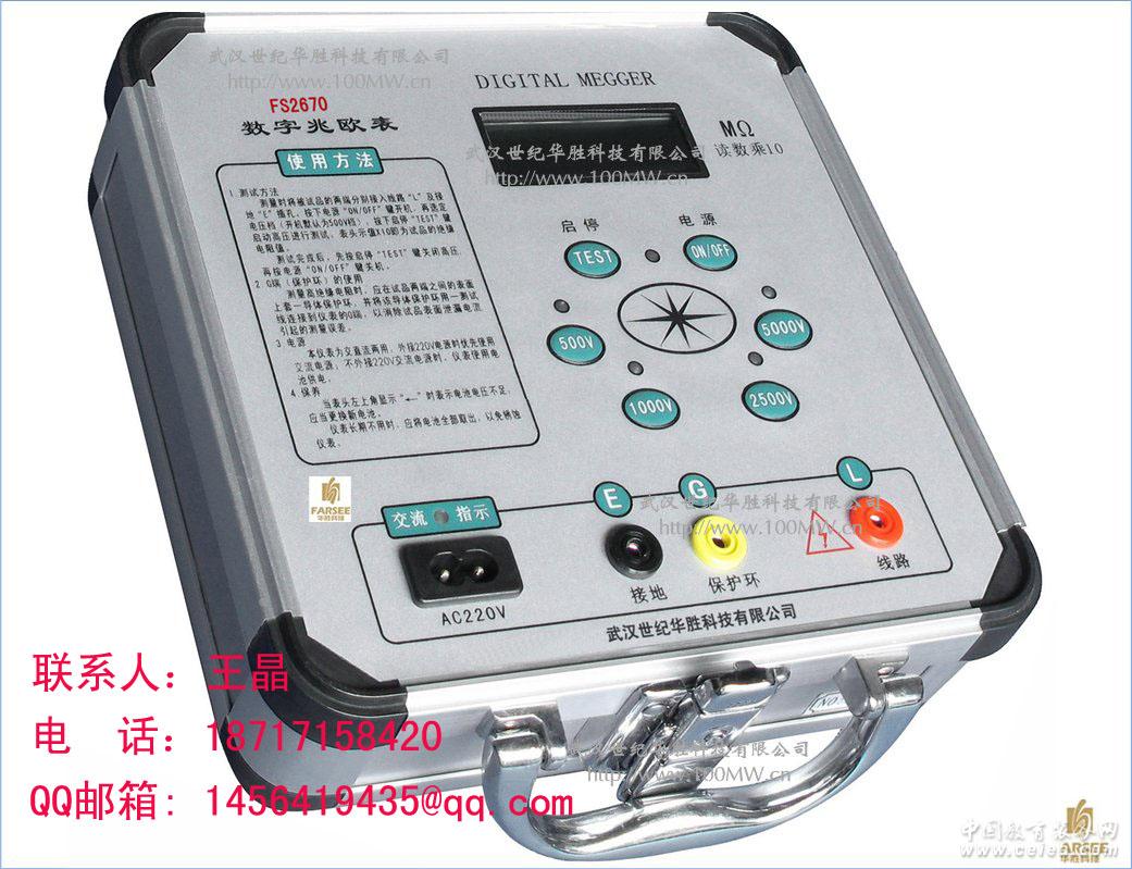 產品詳細介紹◆ 概述 華勝FS2670系列高壓兆歐表(或稱高壓絕緣表)符合國家新頒布電力行業標準《電子式絕緣電阻表DL/T845.1-2004》的規范,能滿足各種電氣設備絕緣電阻測試的要求。儀表內置長效充電電池,操作方便性和安全性明顯優于傳統機械搖表0~20G。
