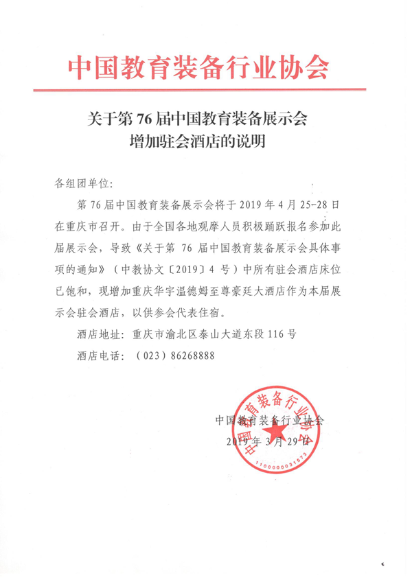 第76屆中國(guó)教育裝備展示會(huì)將于2019年4月25-28日在重慶市召開(kāi)。由于全國(guó)各地觀摩人員積極踴躍報(bào)名參加此屆展示會(huì),導(dǎo)致《關(guān)于第76屆中國(guó)教育裝備展示會(huì)具體事項(xiàng)的通知》(中教協(xié)文〔2019〕4 號(hào))中所有駐會(huì)酒店床位已飽和,現(xiàn)增加重慶華宇溫德姆至尊豪廷大酒店作為本屆展示會(huì)駐會(huì)酒店,以供參會(huì)代表住宿。