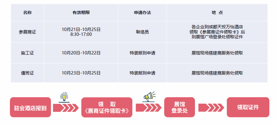 3.參展商到展會駐會酒店成都天投萬怡酒店(成都市雙流區(qū)天府新區(qū)博覽城路288號)聯(lián)絡(luò)員房間(具體報到房間見酒店大堂公示)領(lǐng)取《展商證件領(lǐng)取卡》,再到中國西部國際博覽城展館廣場入口的登錄處換取參展商證:一個展位配2張參展商證。